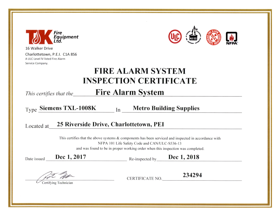 Fire Alarm Inspection – 12-01-2017