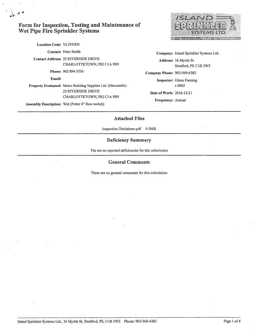 Sprinkler Inspection – 12-21-2016